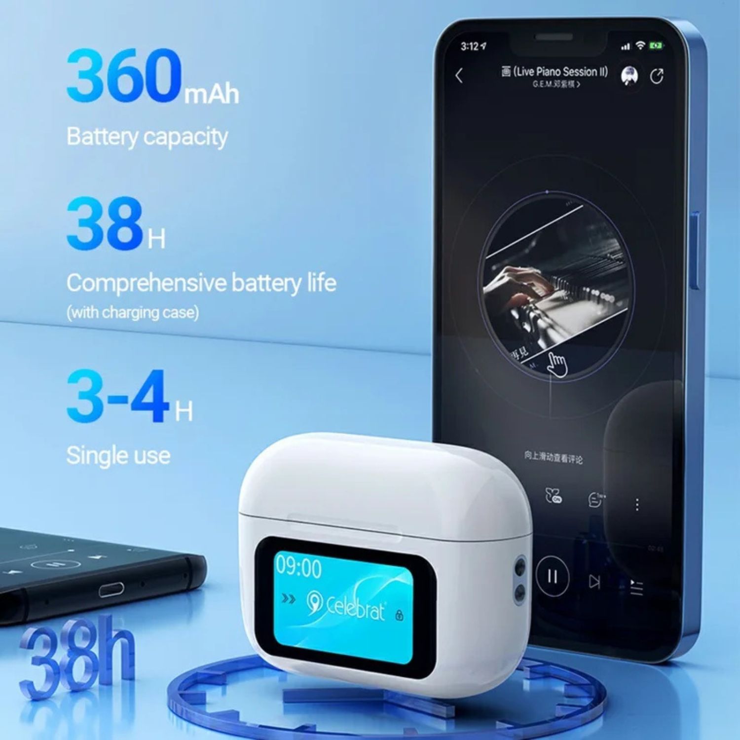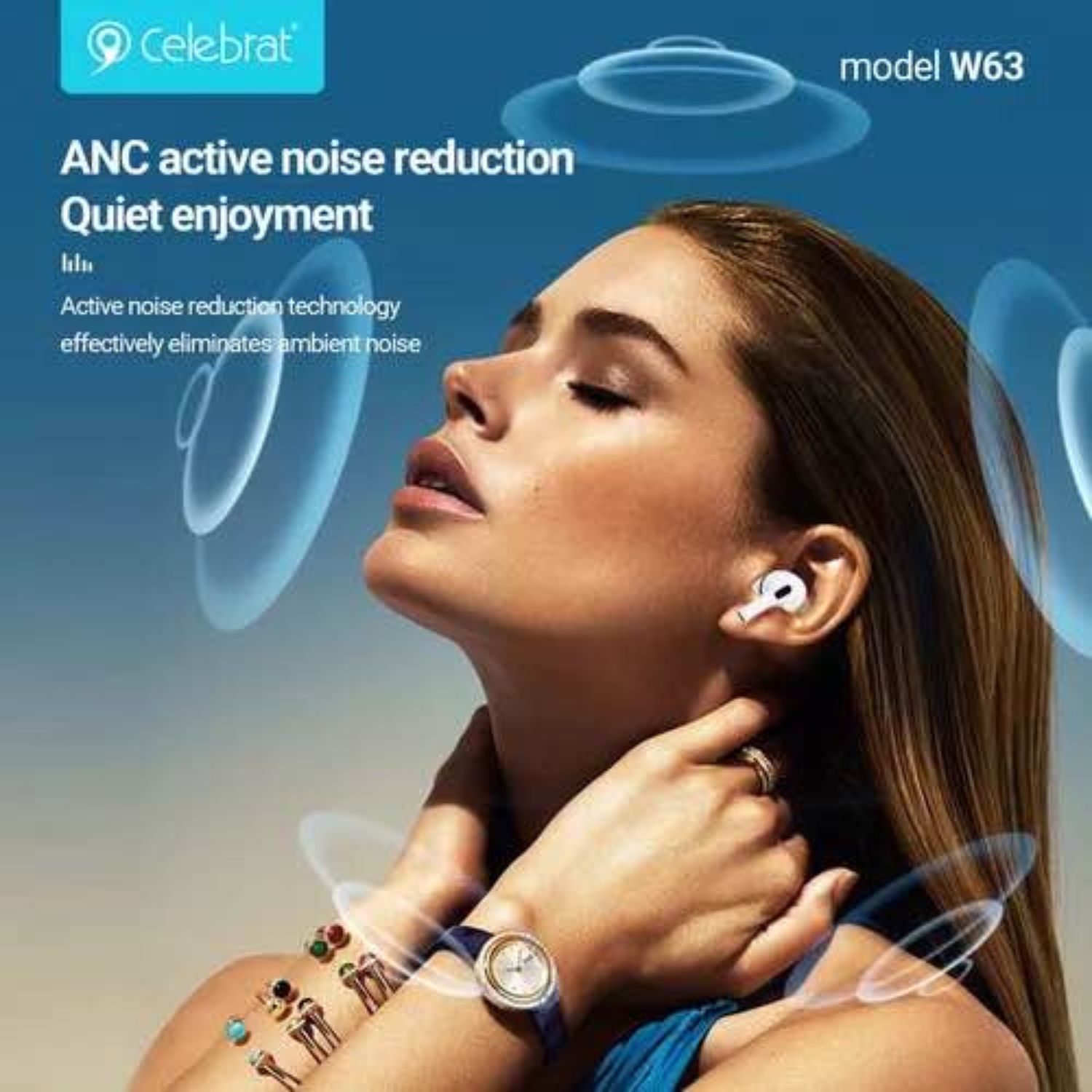 ایرباد Celebrat W63 یک مدل ترو وایرلس (TWS) با طراحی مدرن و امکانات پیشرفته است که برای کاربرانی طراحی شده که به کیفیت صدا، کنترل هوشمند و راحتی اهمیت میدهند. این هدفونها دارای حذف نویز فعال (ANC) هستند و کیس شارژ آنها مجهز به یک صفحه نمایش لمسی رنگی است که امکان نمایش وضعیت باتری، تغییر اکولایزر، کنترل صدا، فعالسازی ANC و حالت شفاف (Transparency Mode) را فراهم میکند.