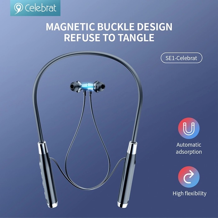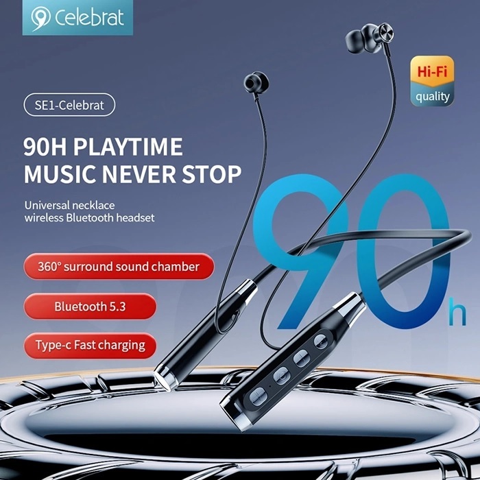 هندزفری بی سیم امروزه کارای زیادی دارند. و گوش دادن به موسیقی هنگام ورزش یا کار باب شده. و همچنین مکالمه را آسان کرده. زیرا خطر افتادن گوشی را کم میکند. و مناسب برای در امان ماندن از دزد های گوشی است. و هنگام انجام کار میتوانید از آن استفاده کنید. با پیشرفت تکنولوژی و استقبال زیاد از این محصولات. تولید کنندگان انواع مختلفی از هدفون ها با کیفیت بالا تولید کردند. هندزفری بی سیم بلوتوثی سلبریت (CELEBRAT) مدل SE1 .یکی از بهترین هندفری های بلوتوثی موجود در بازار است.این محصول دارای میکروفون HD است. تا شما بتوانید مکالمه ای راحت و بدون نویز داشته باشید. داخل جعبه هندزفری بیسیم celebrat گوشی های سیلیکونی با ابعاد مختلف موجود میباشد. گوشی های این محصول مناسب با ارگونومی گوش طراحی شده است. تا در استفاده ی بلند مدت باعث خستگی گوش شما نشود.این نوع هدفون مناسب افرادی است که نگران گم شدن هدفون های کوچیک هستند. شرکت celebrat به صورت تخصصی در حال تولید محصولات صوتی است.قسمت دور گردنی این محصول کاملا نرم و انعطاف پذیر است و نمیشکند.با این هدفون راحت به فعالیت های ورزشی بپردازید و نگران بیرون آمدن آن از گوشتان نباشید.سری های گوشی مگنتی است و وقتی از گوشتان در بیاورید به هم میچسبند. هدفون بی سیم مدل se1 محصول شرکت سلبریت ، دارای بلوتوث 5.3 ، جذب مغناطیسی ، باطری 800 میلی آمپر ساعت که مناسب یرای حدود 90 ساعت پخش موسیقی و حدود 85 ساعت زمان مکالمه تلفنی میباشد.