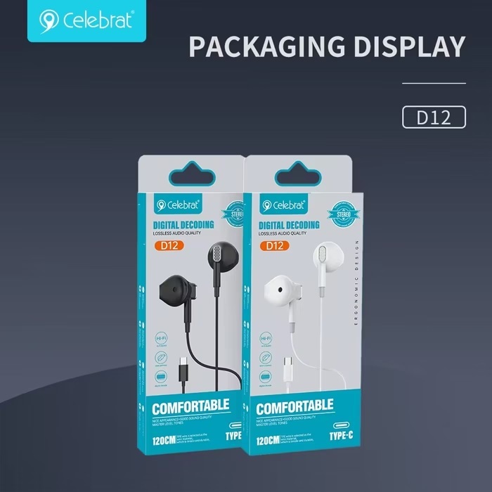 هندزفری سلبریت D12 در رنگ های سفید و مشکی، با طراحی زیبا و ارگونومیک تولید شده است که راحتی استفاده طولانی مدت را تضمین می کند. این هندزفری با رابط تایپ سی، مناسب دستگاه هایی است که فاقد جک 3.5 میلی متری هستند.