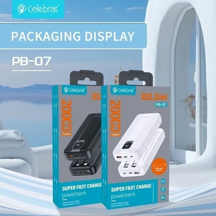 پاوربانک سلبریت مدل PB 07 با ظرفیت 20000 میلی آمپر و همراه با کابل طراحی شده است در این پاوربانک از ال سی دی جهت نمایش مقدار شارژ پاوربانک به صورت درصد استفاده شده است.
